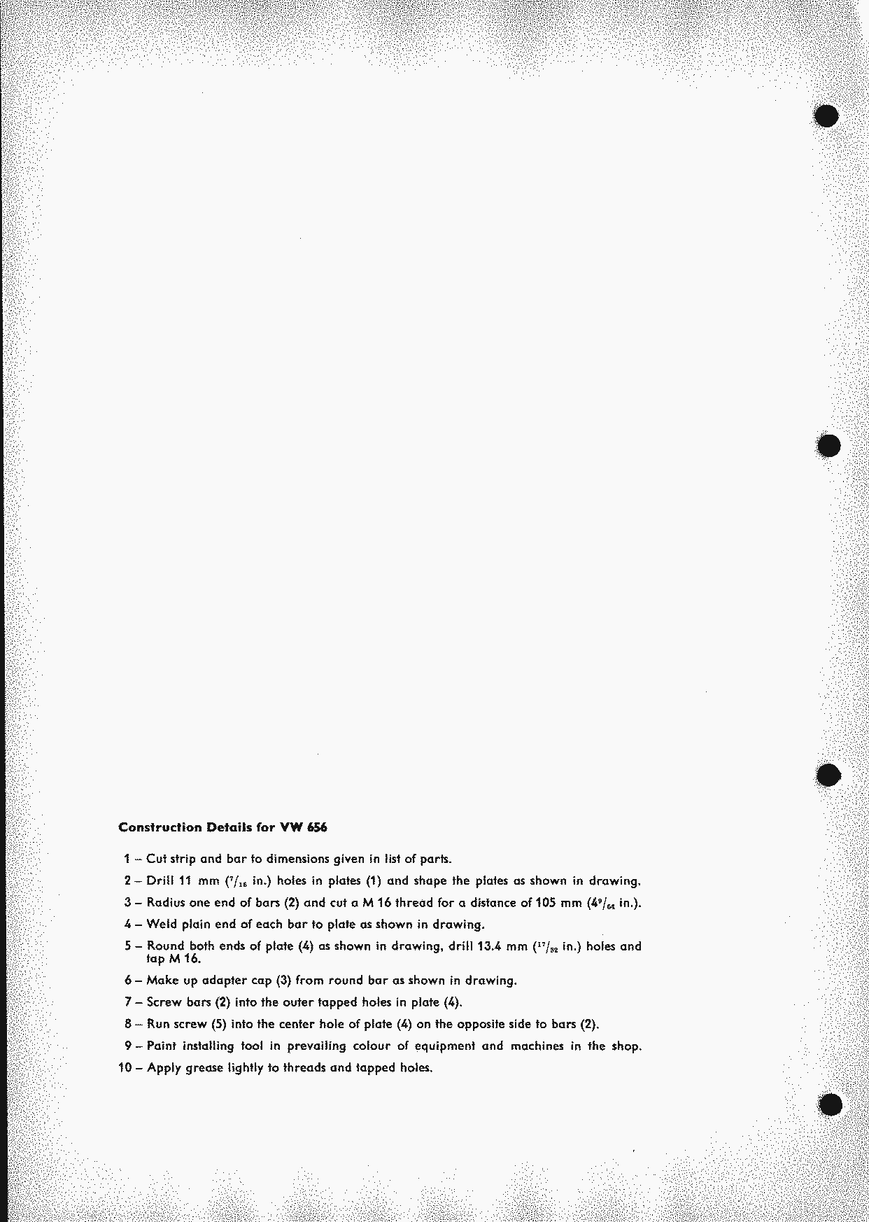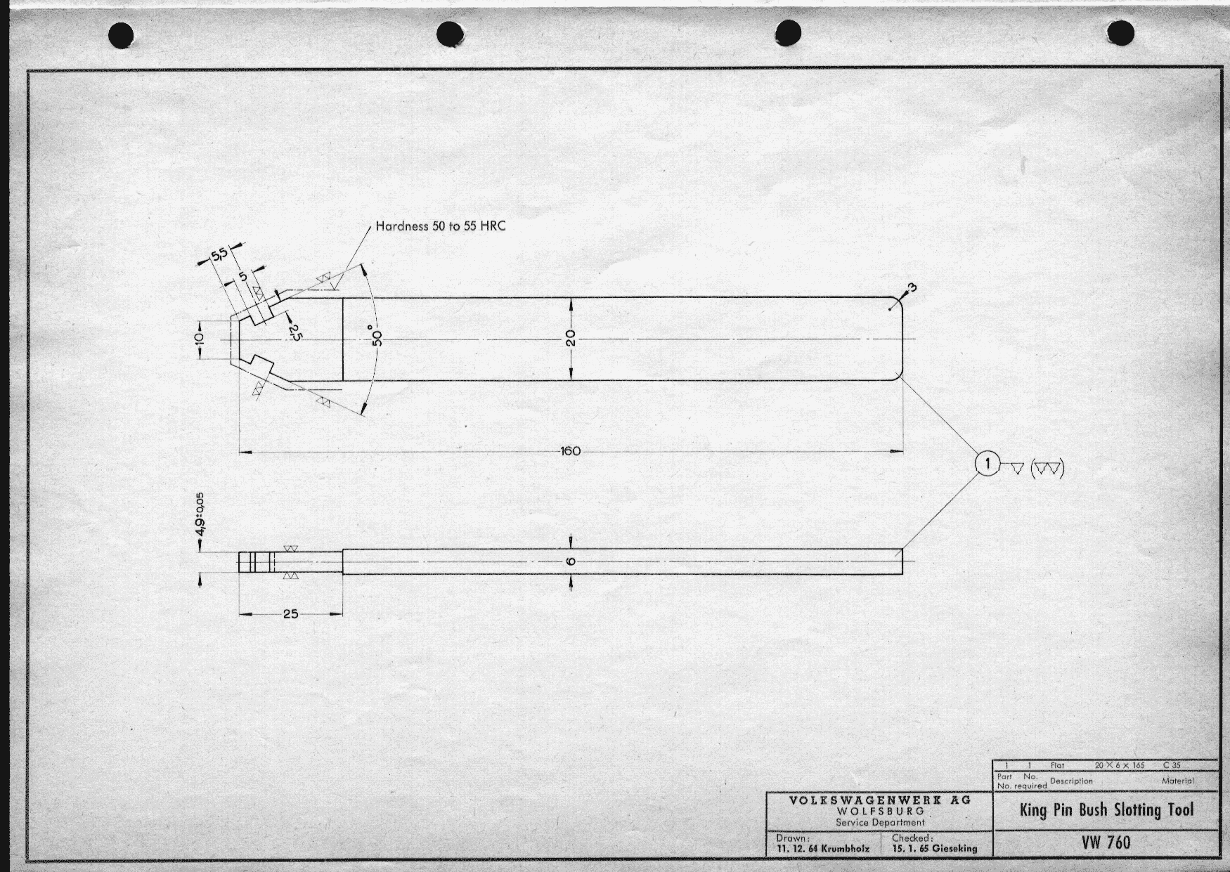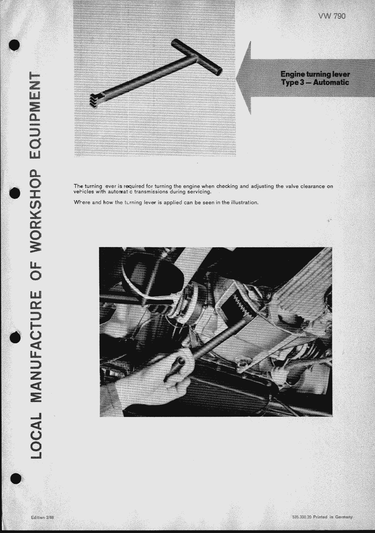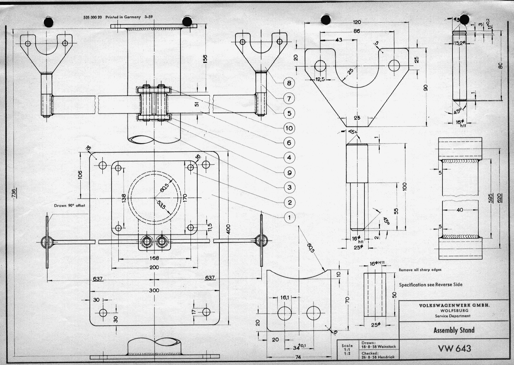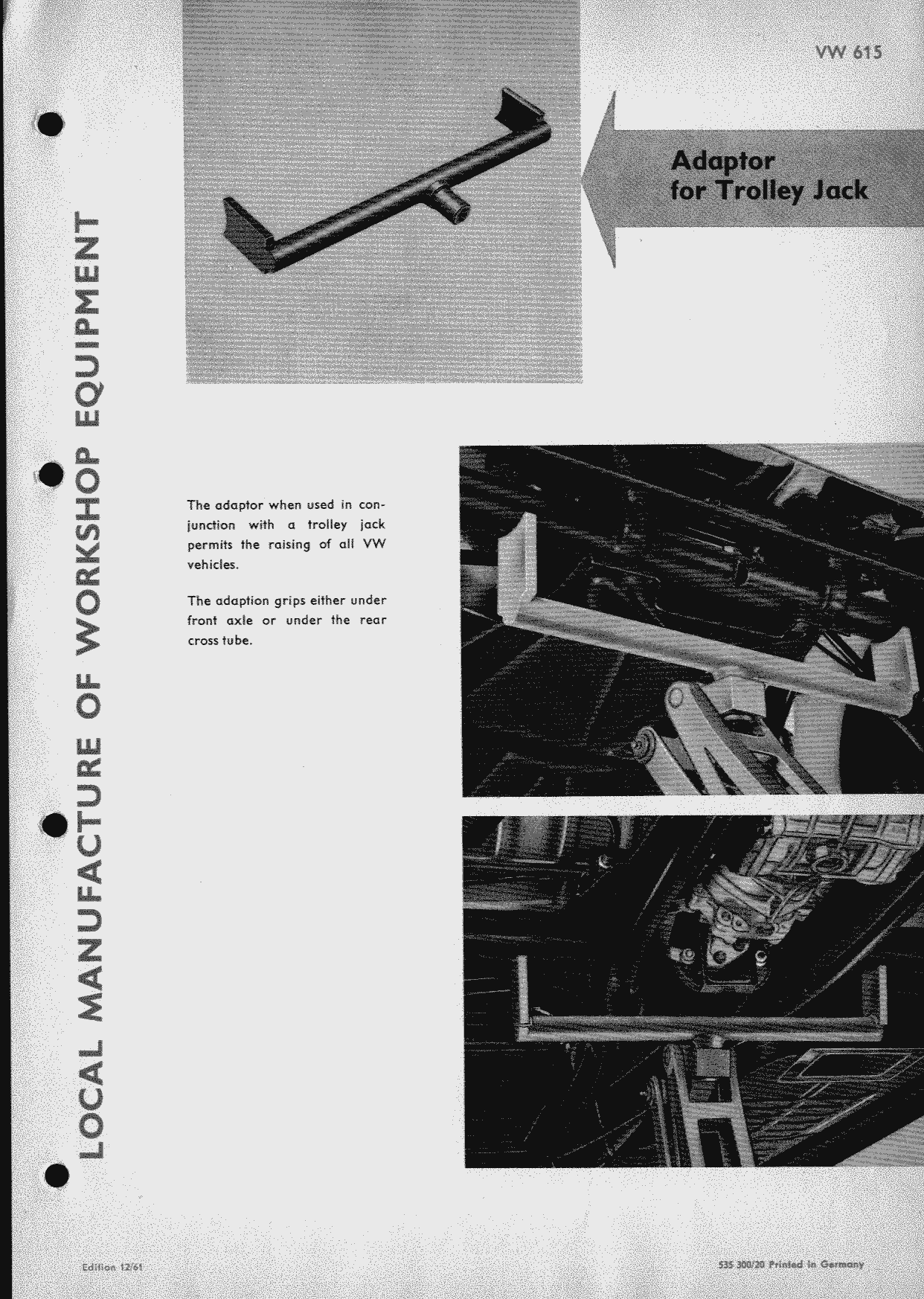 This manual contains descriptions and blueprints for over 100 special tools for working on air-cooled VWs -- everything from a body trolley for Type 1s to a headlight bucket alignment jig for Type 34s.