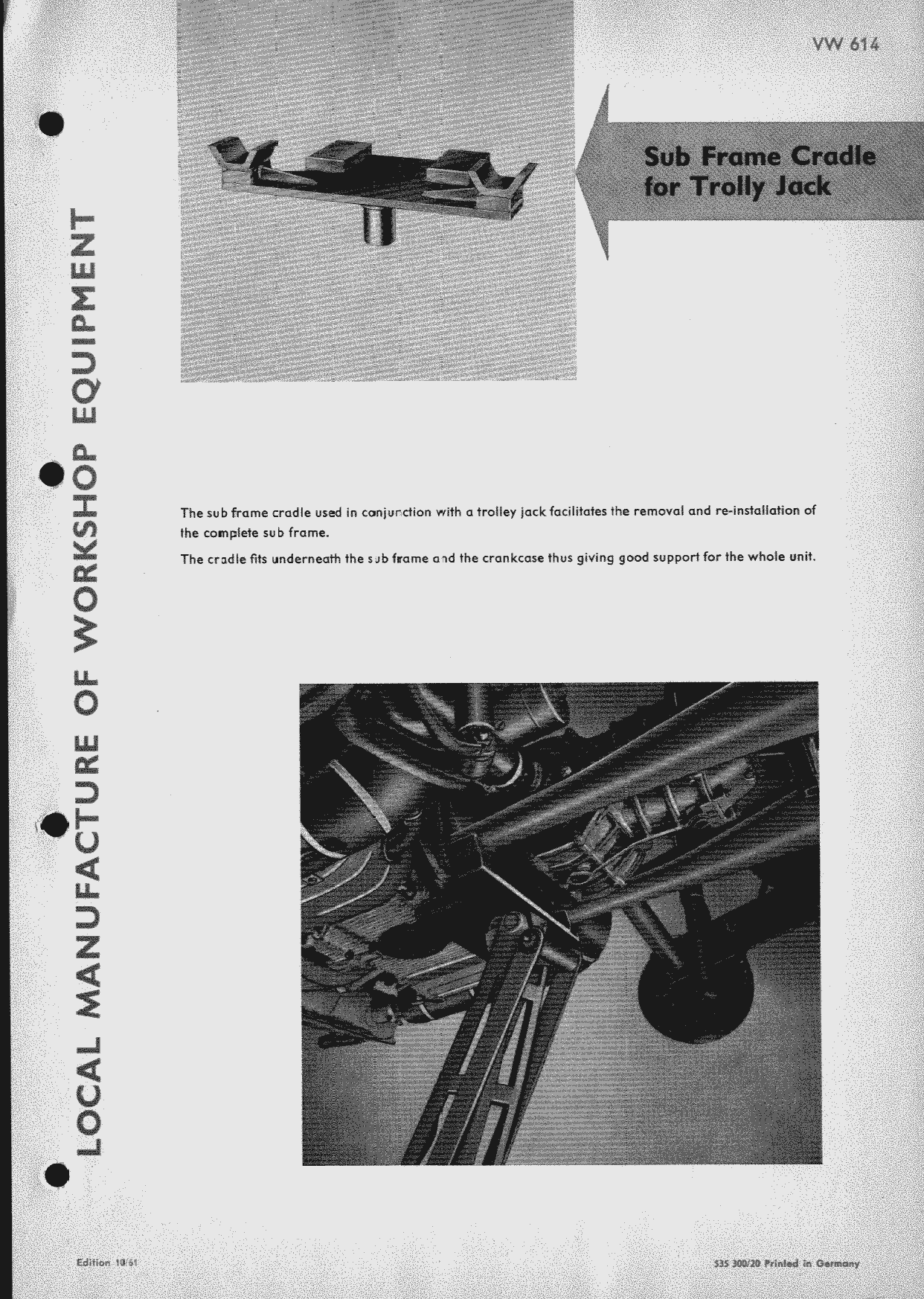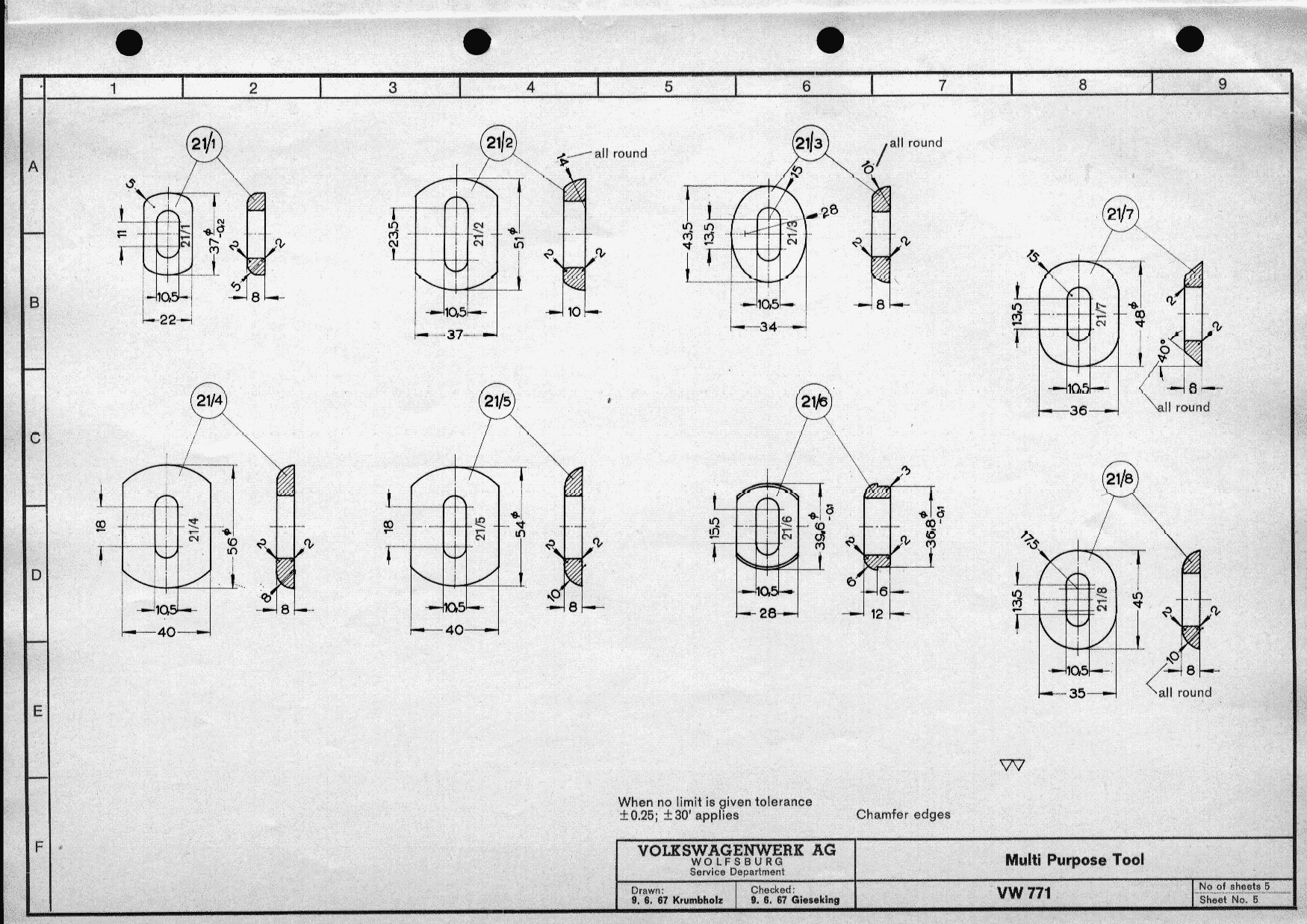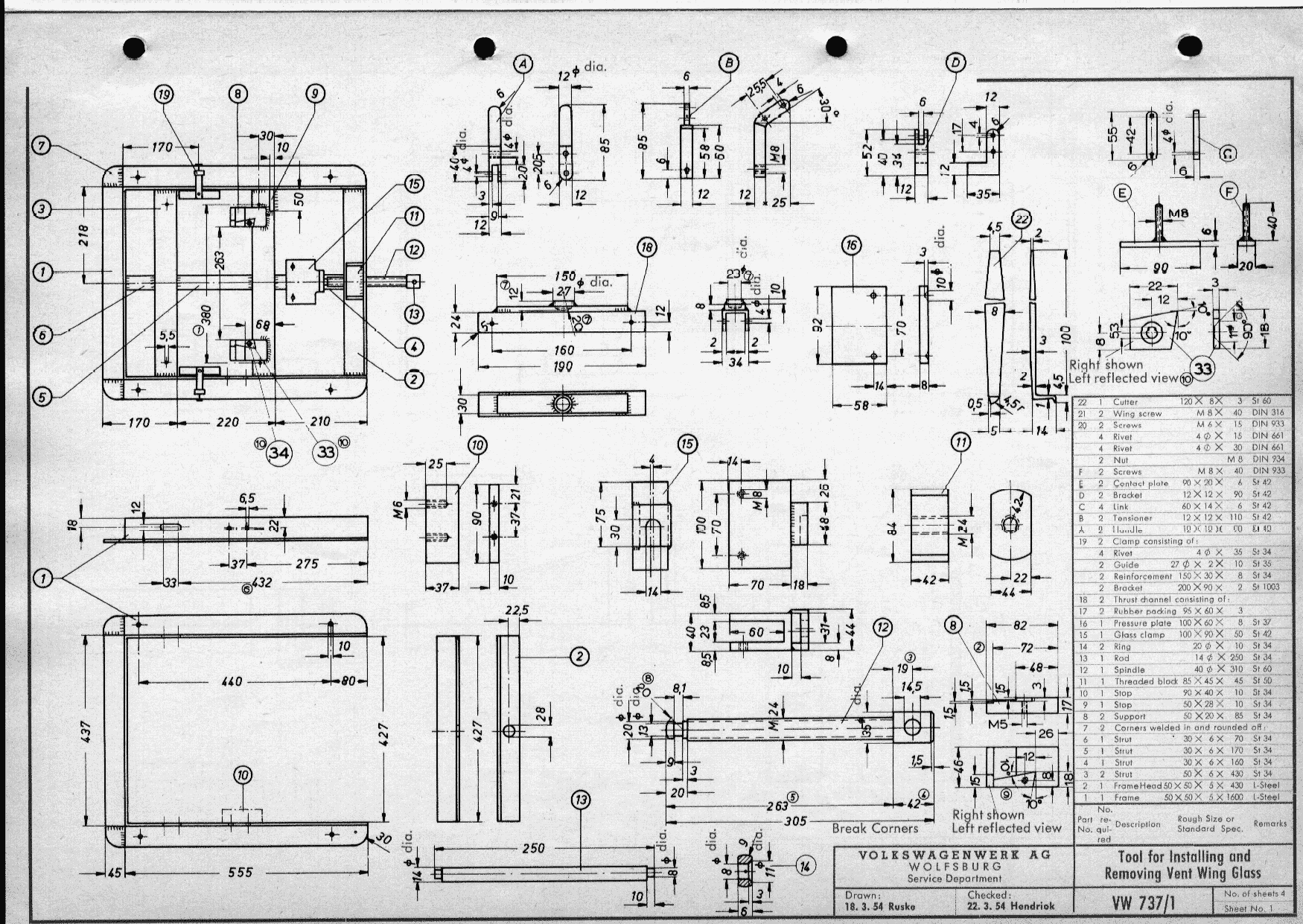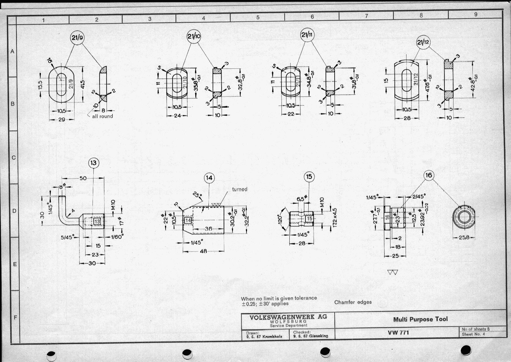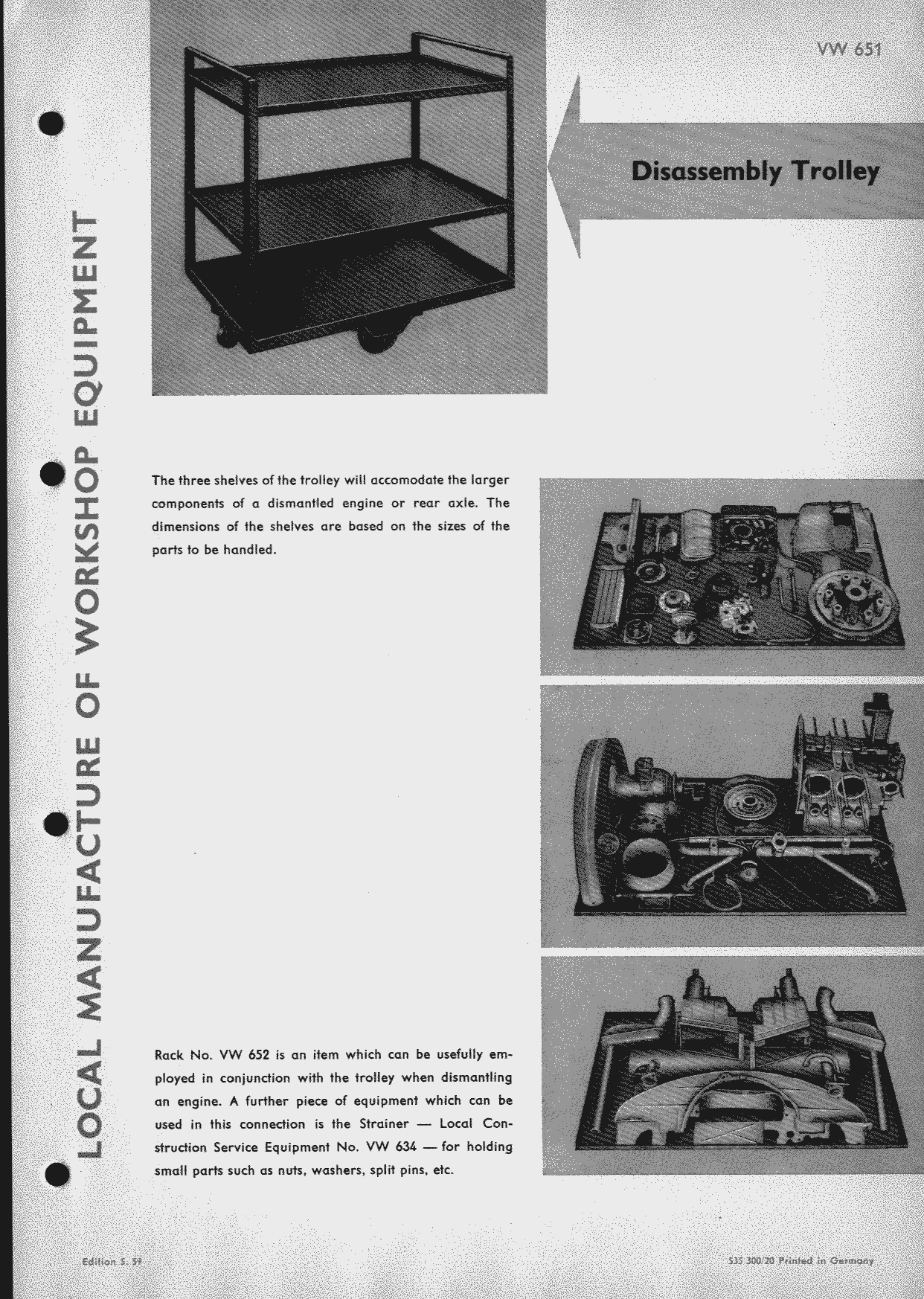This manual contains descriptions and blueprints for over 100 special tools for working on air-cooled VWs -- everything from a body trolley for Type 1s to a headlight bucket alignment jig for Type 34s.